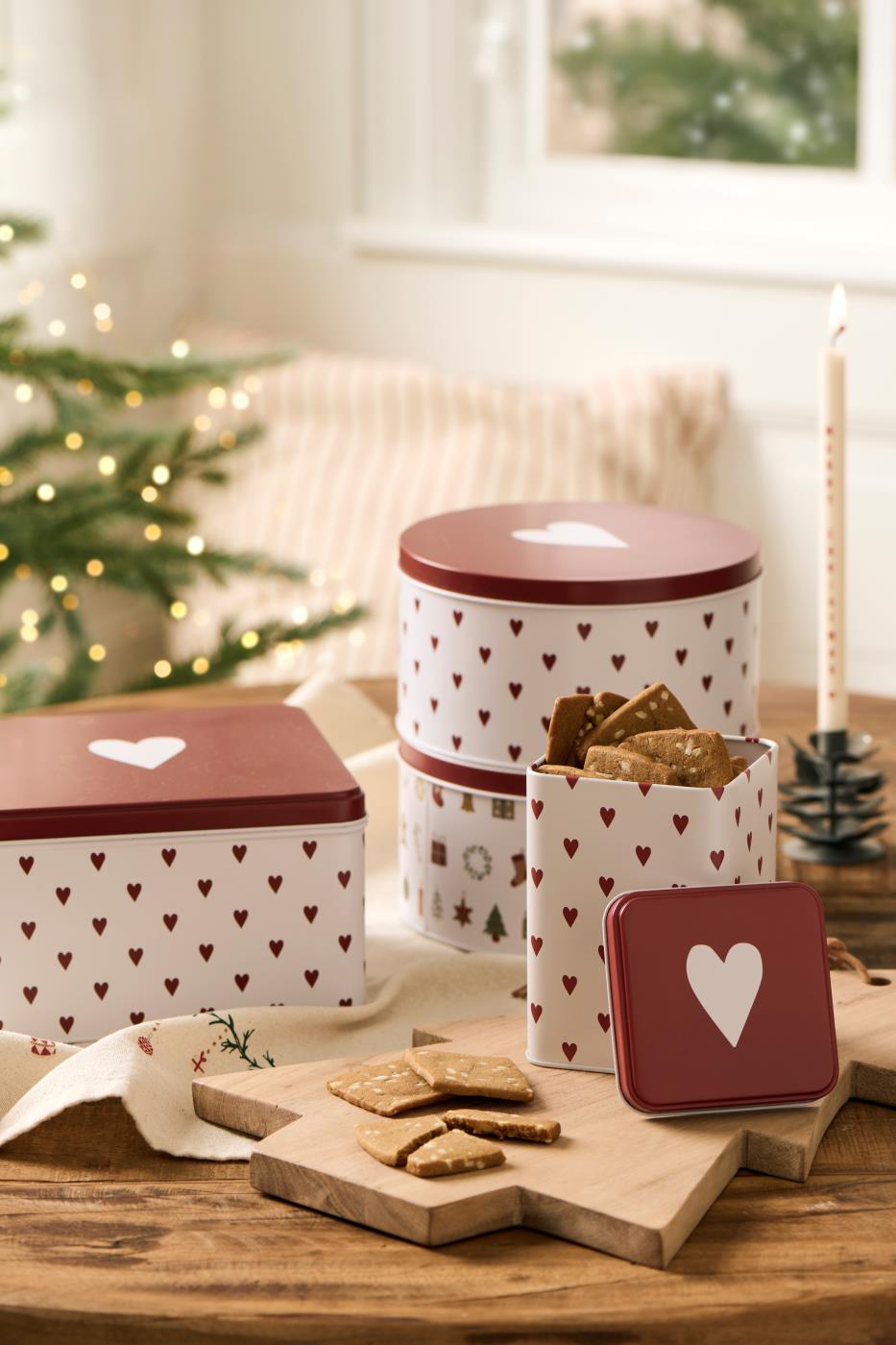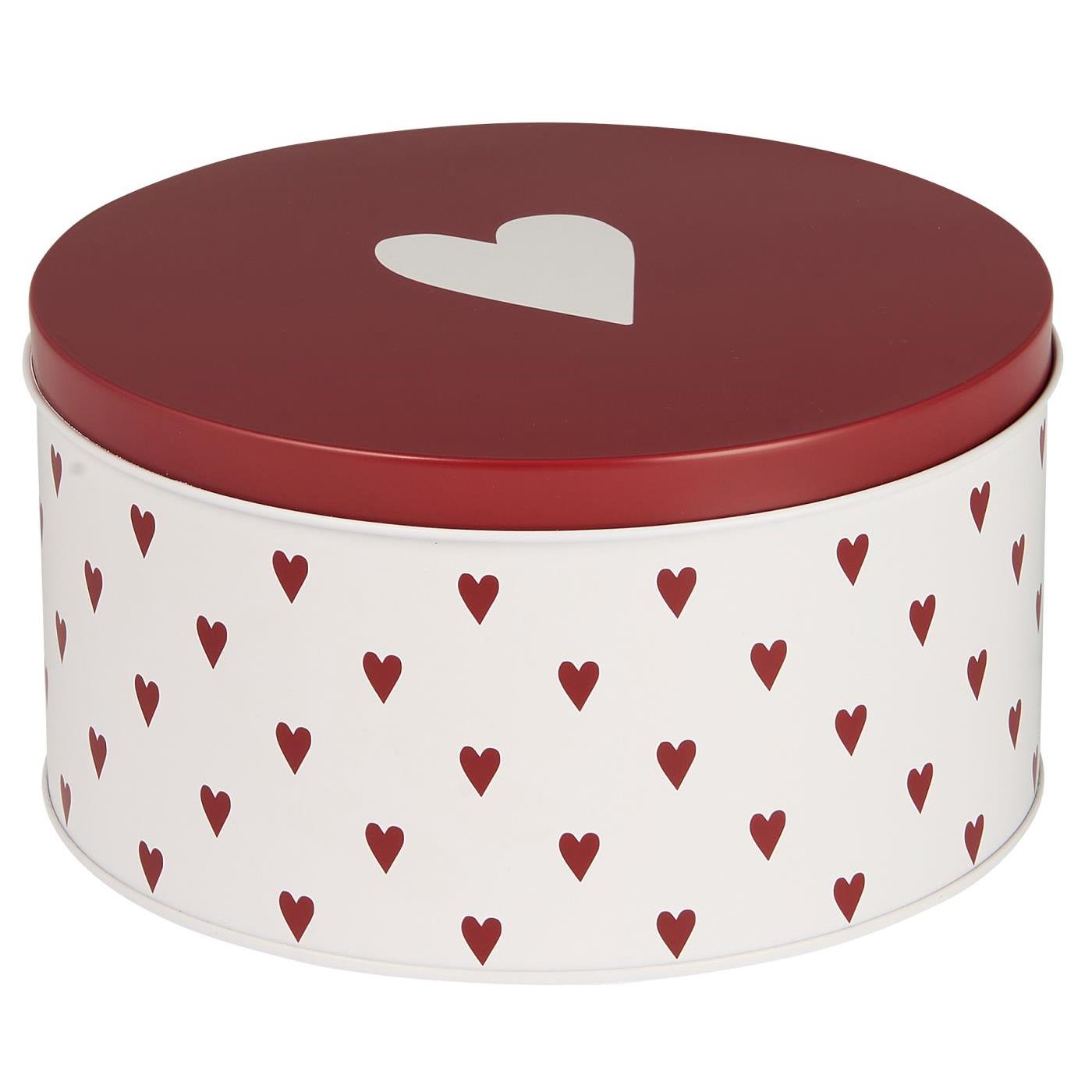 Runde Gebäckdose mit Herzen. Perfekt zur Aufbewahrung von Keksen oder Snacks. Hergestellt aus Metall und lebensmittelsicher.