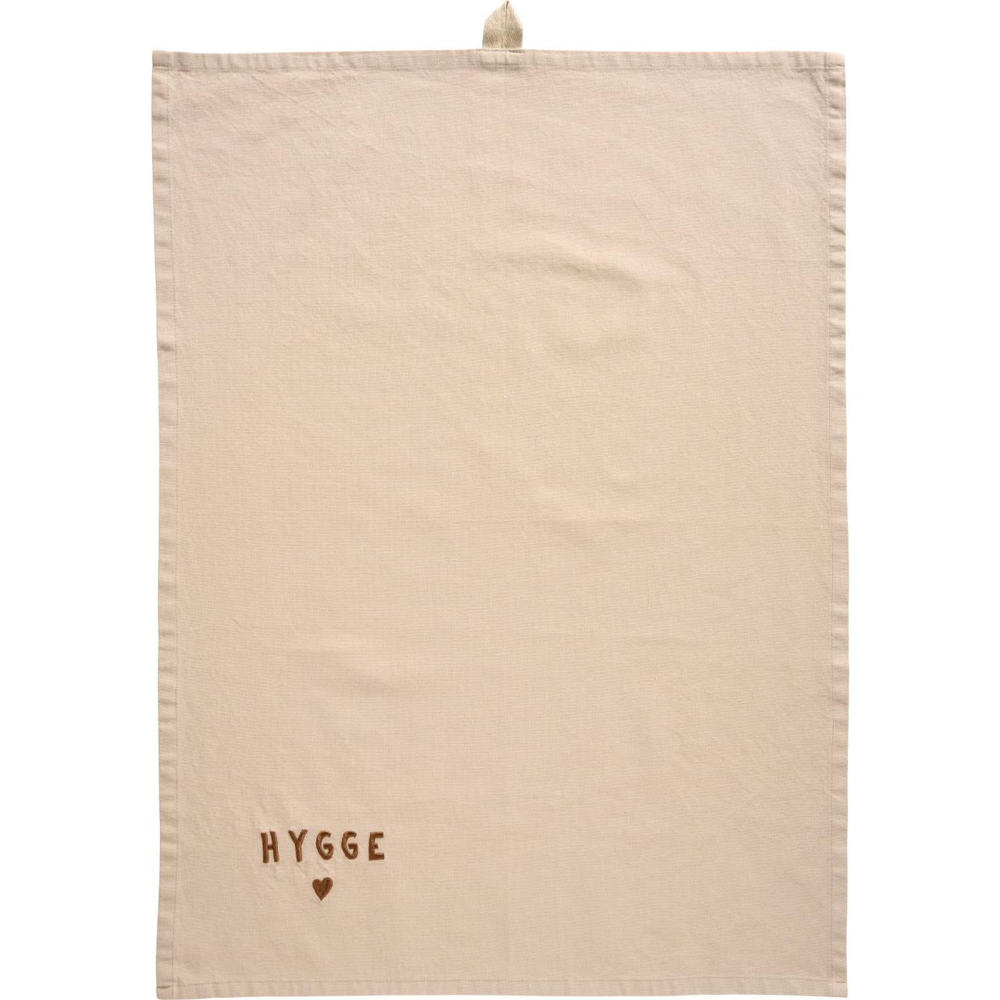 Schönes leinenfarbiges Geschirrtuch mit liebevoller Hygge Stickerei in braun.