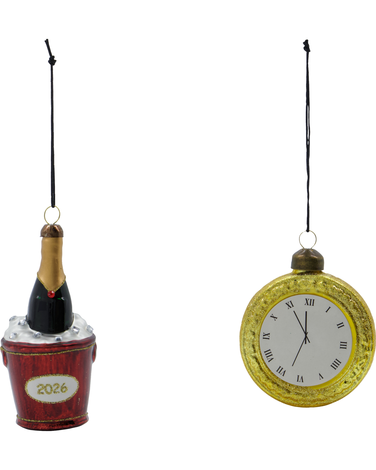 Erleben Sie die festliche Stimmung mit diesen eleganten und verspielten Ornamenten aus mundgeblasenem Glas. Dieses Set besteht aus zwei Designs: einer Uhr, die den Countdown bis Mitternacht symbolisiert, und einer Champagnerflasche in einem Kühlbehälter mit der Jahreszahl 2026. Perfekt für den Weihnachtsbaum oder einen dekorativen Zweig. - Mundgeblasenes Glas - Zwei einzigartige Designs - Perfekt für Silvester - Ideale Geschenkidee Lassen Sie diese Ornamente Ihre Dekoration erstrahlen und feiern Sie stilvoll den Jahreswechsel!